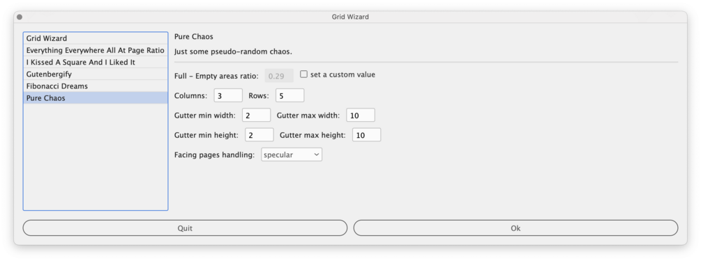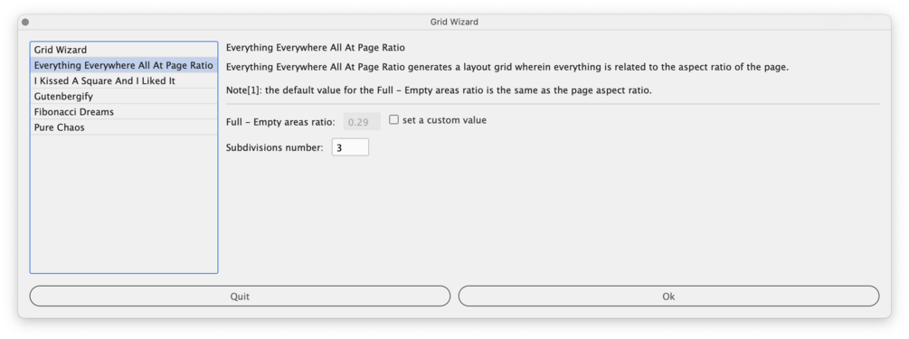 - Full - Empty areas ratio: defines the ratio between the area covered by the margins and the one covered by the grid (the default value is the same as the aspect ratio of the page).