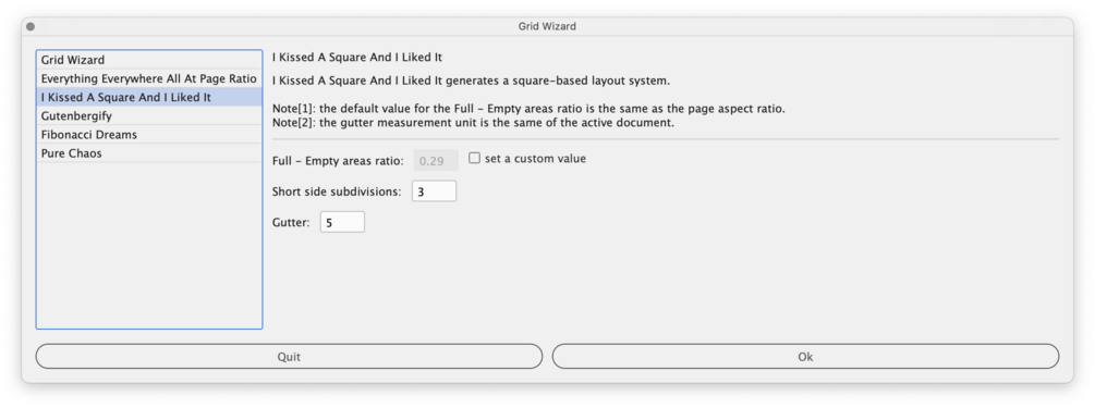 - Subdivisions number: defines the number of rows and columns occupying the rectangle defined by the margins (the default value is the one used by Gutenberg).